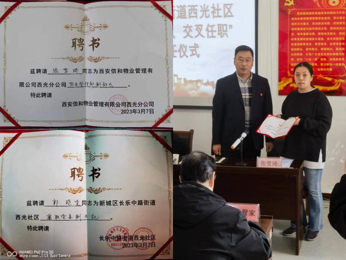 在前期相互對(duì)接征求意見的基礎上,确定了雙向(xiàng)進(jìn)入交叉任職實施方案和信和物業與西光社區互駐兼職人員,确定社區聘任信和物業總經(jīng)理郭曉堂爲社區黨委兼職副書記,西光社區副主任張雪琦爲信和物業西光分公司物業管理部兼職副部長(cháng),雙方并就今後(hòu)的工作方向(xiàng)工作重點及開(kāi)展的服務進(jìn)行了交流溝通